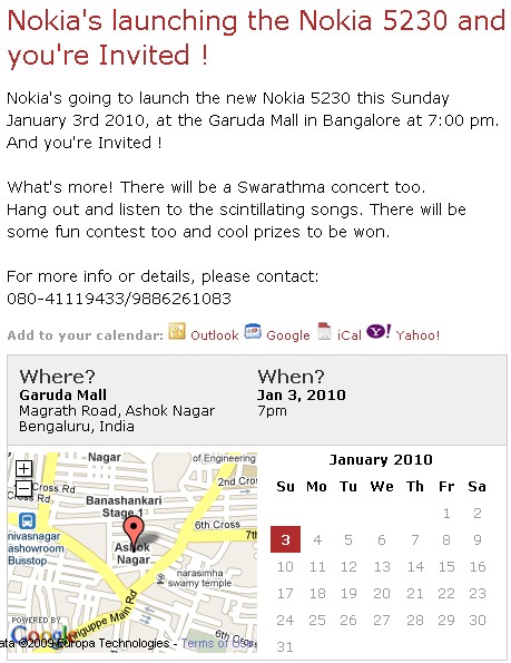 The Nokia 5230 is the latest Touchscreen music device from Nokia and it is expected to be in stores soon. Nokia India is inviting you to the Bangalore Launch of the 5230 . Details inside.