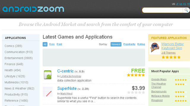 My personal favorite being Androidzoom for its perfect categorization of the apps. If you want an app to calculate your net salary, you can search in the finance category. Want something for your songs? browse the Multimedia Category. You can also look out for only-free and only-paid apps. Moreover, the design of the site is so neat that you might end up getting more apps for your Android than you expected. True! No kidding. The only thing lacking on this site is you cannot review, comment on the app and in return get no information from end users about the app before downloading.