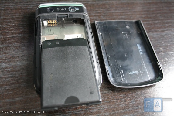 The memory card slot is underneath the battery cover, and RIM took a step down from the 9000 and decided to make it inaccessible for hot-swap. The device will have to be powered down for you to take the SIM and microSDHC card in/out. The Rogers 9700 comes pre-loaded with a 2GB microSDHC.