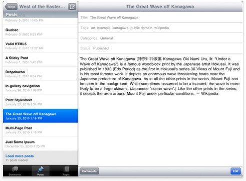 This is one of the apps I’m most excited about as you can blog from the iPad using this official WordPress iPad app. You can create posts / pages , manage comments and preview your posts. The interface on the iPad is slightly different than the iPhone version.