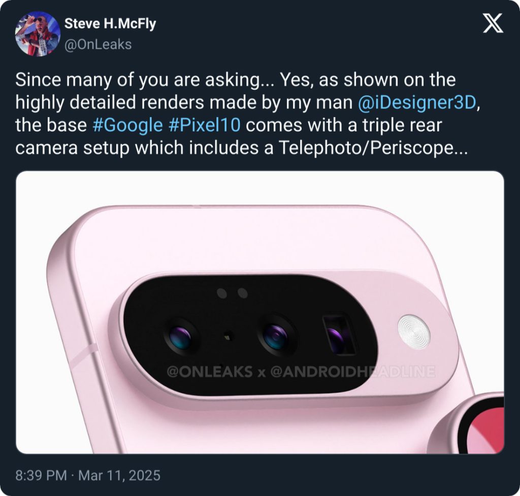 The phone is said to measure 152.8 x 72 x 8.6mm (12mm including the camera bump), similar to the Pixel 9 since it is said to retain a similar 6.3-inch OLED screen. According to @OnLeaks, the Pixel 10 will also get a triple camera set up for the first time since it will include a telephoto camera.