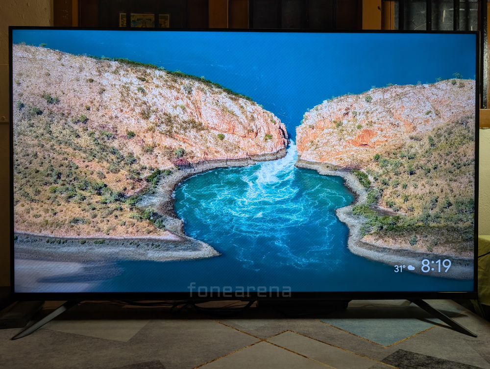 The TV rests on two feet-style stands which feel rigid and provide a very satisfactory solid base, more reassuring than many competitors. For this 50-inch model, they are spaced 99cm apart, requiring a reasonably wide table surface. While we didn’t test wall mounting (VESA support is confirmed, but a mount wasn’t provided), the easily visible ports suggest access shouldn’t be too difficult. Handling the TV during setup was also surprisingly manageable. Despite being a 50-inch panel, its 13.5kg weight (with stand) felt balanced, and one person could comfortably attach the stands, place it on a table, and even carry it up a flight of stairs. It doesn’t feel unwieldy, though larger screen sizes in the lineup would likely necessitate two people. Cable management is basic, relying on the flexibility offered by a detachable SMPS-style power cable rather than built-in clips or channels. Overall, the design and build quality punch above their weight, delivering a solid, premium-feeling package with thoughtful user-centric details.
