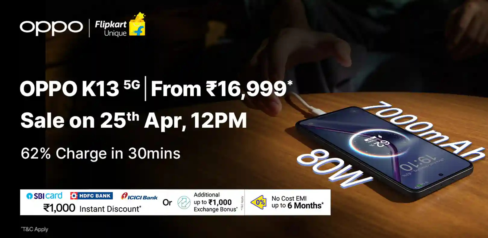 OPPO K13 5G with 6.67″ FHD+ 120Hz AMOLED display, Snapdragon 6 Gen 4, 7000mAh battery launched in India starting at Rs. 17999
