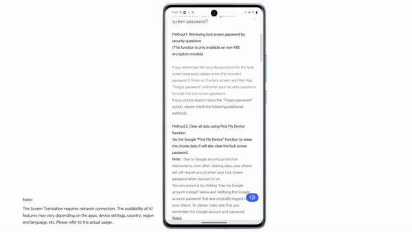 AI Screen Translation enables real-time translation of on-screen content. Whether reading an international website or scrolling through foreign-language material, users can translate the full screen instantly—without needing to switch apps.