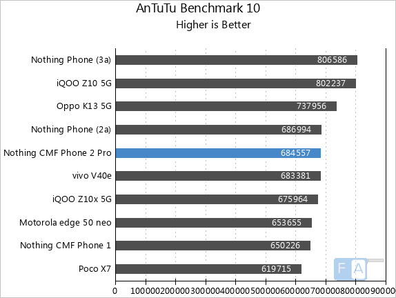 This shows a good improvement in performance compared to the CMF Phone 1, but the competitors with Snapdragon 6 Gen 4 is slightly better.