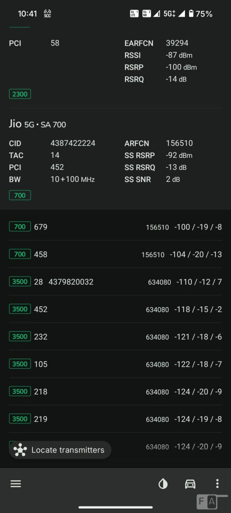 bands, dual 4G VoLTE, 5G VoNR, Wi-Fi 6 802.11 ax (2.4 + 5GHz), Bluetooth 5.4 with LHDC option for supported headphones, GPS + GLONASS, but lacks NFC support. The phone also has carrier aggregation and I even got 5G++ in some places. We did not face any call drops and the earpiece volume is good, even though it is present on the top edge.