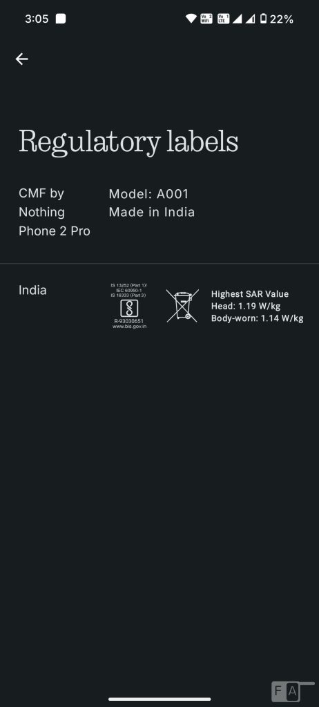 The CMF Phone 2’s body SAR is 1.14W/Kg and head SAR is at 1.19/Kg which higher than some mid-range phones, however it well under the limit in India, which is 1.6 W/kg (over 1 g).