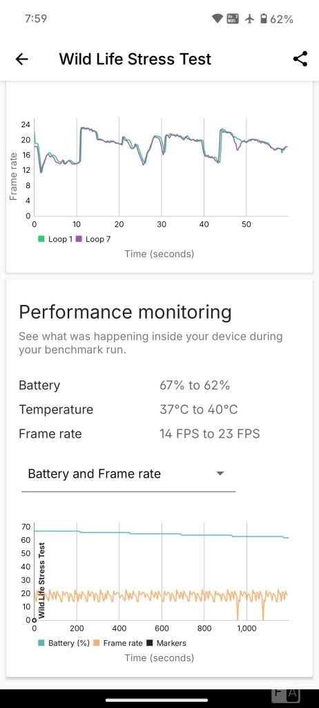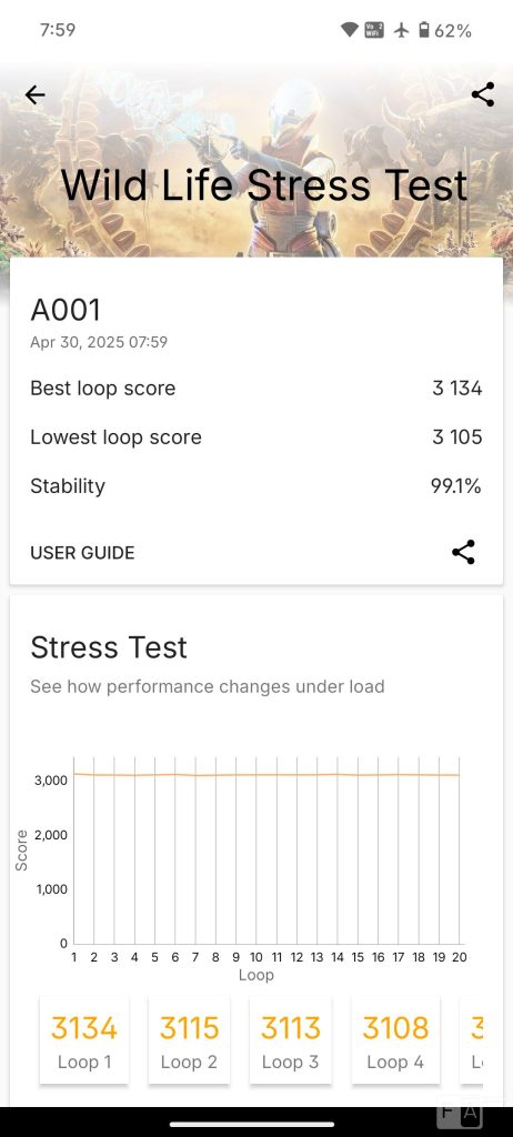 In 3D Mark wild life stress test, it scored 99.2% which is good. The temperature increased from 37 to 40 degrees, which is not much. That said, check out some synthetic benchmark scores below.