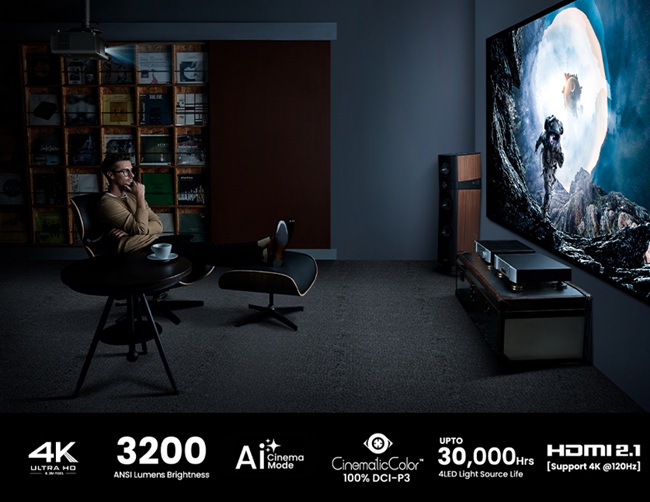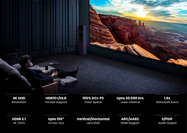The projector includes a 1.6x motorized zoom, digital four-way lens shift, and a 1.0-1.6 throw ratio, allowing a 180-inch screen from 4 meters away.