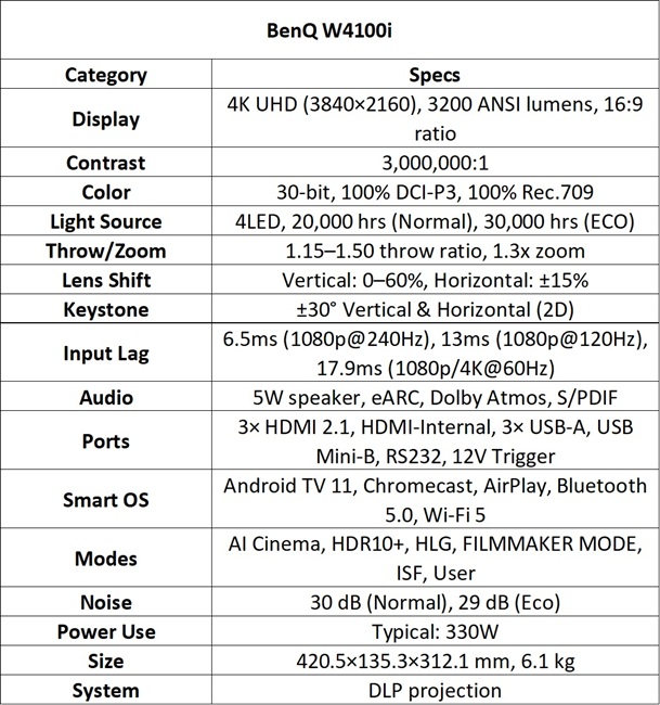 The W4100i, suited for everyday use, offers 3200 ANSI lumens brightness using a 4LED light source, also lasting up to 30,000 hours. It features a smart mode that optimizes visuals based on content and room lighting, plus built-in Google-certified Android TV with Netflix and streaming apps.