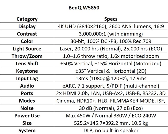 The W5850 is designed for large-scale viewing, capable of projecting a 200-inch image with sharp colors and contrast, ideal for dark rooms. It features a blue core laser with 2600 lumens brightness (2100 lumens at 100% DCI-P3) and a lifespan of up to 30,000 hours.