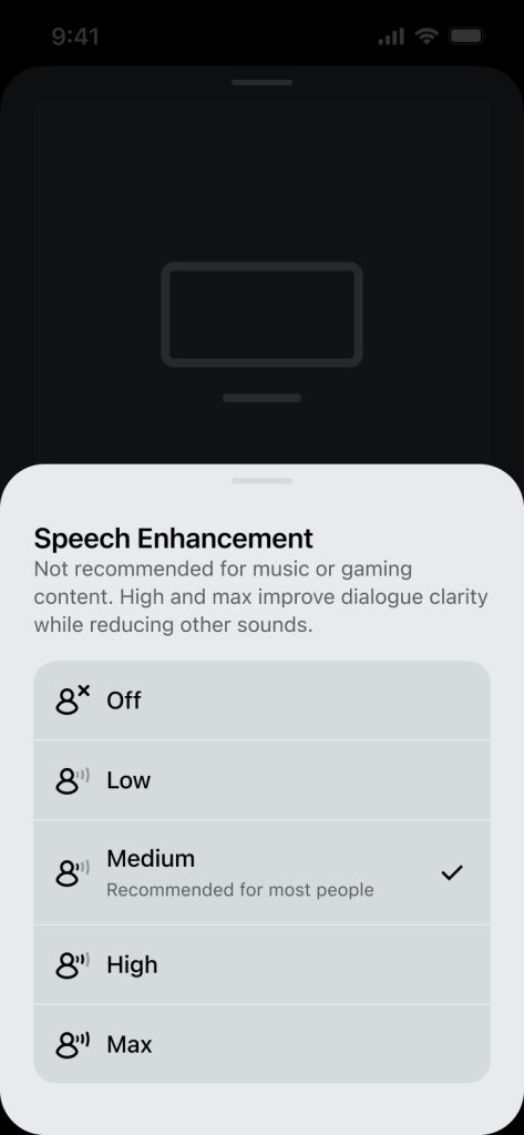 - Max: Designed for users with hearing loss, this setting prioritizes dialogue above all else, reducing non-speech sounds to maintain focus.