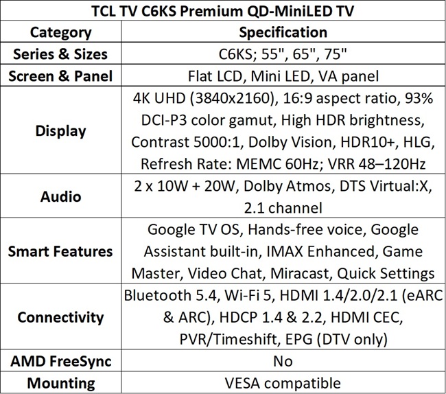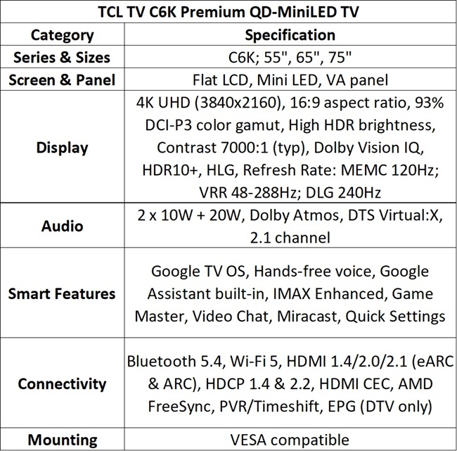 Quick specifications: C6KS Premium QD-MiniLED TV
