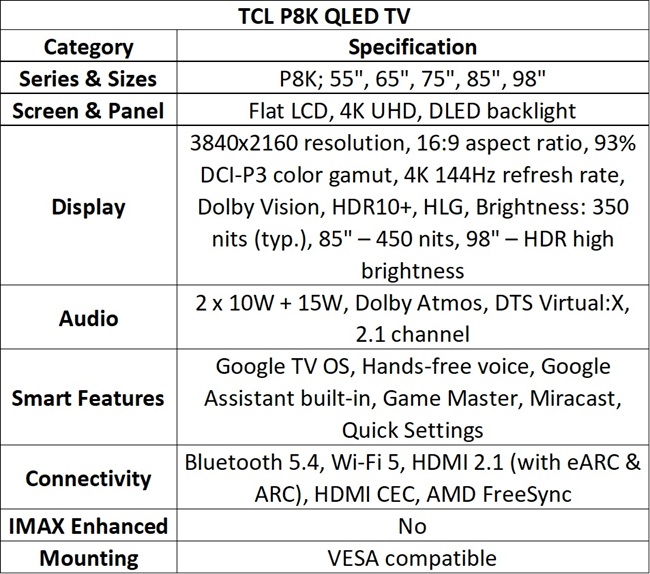 - P8K: 98-inch (239.5 cm), 85-inch (206 cm), 75-inch (185 cm), 65-inch (160.8 cm), 55-inch (136 cm)