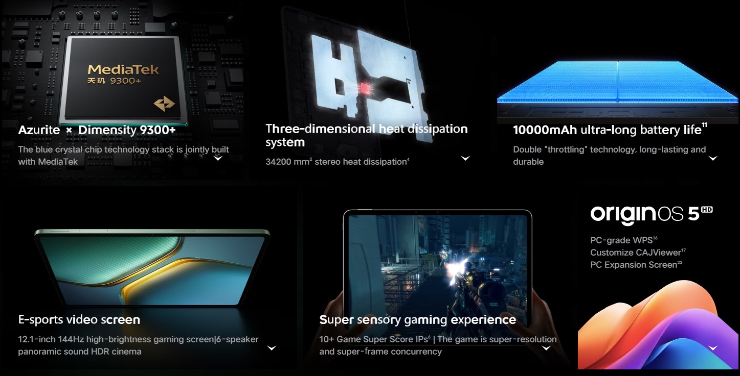 The iQOO Pad 5 features a large 12.1″ 2.8K 144Hz LCD screen, MediaTek Dimensity 9300+ gaming processor, up to 16GB LPDDR5X RAM, 512GB UFS 4.1 fast storage, and a 6-speaker 3D sound system. The Pro variant, on the other hand, comes with a Dimensity 9400+ SoC, a 13″ large 3.1K 144Hz LCD screen, and iQOO’s self-developed Super Audio 6.0 based 8-speaker 3D sound system.