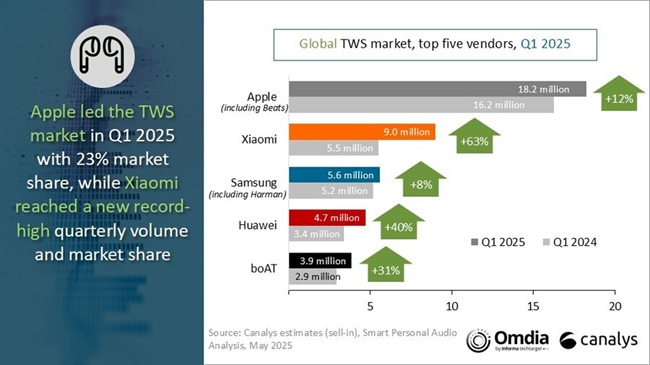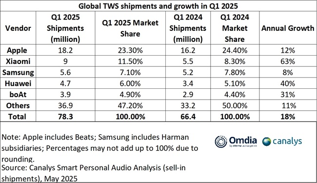 The global market for true wireless stereo (TWS) earbuds showed significant recovery in the first quarter of 2025. Shipments rose 18% compared to the previous year, reaching 78 million units, marking the fastest growth since 2021, according to Canalys, now part of Omdia.