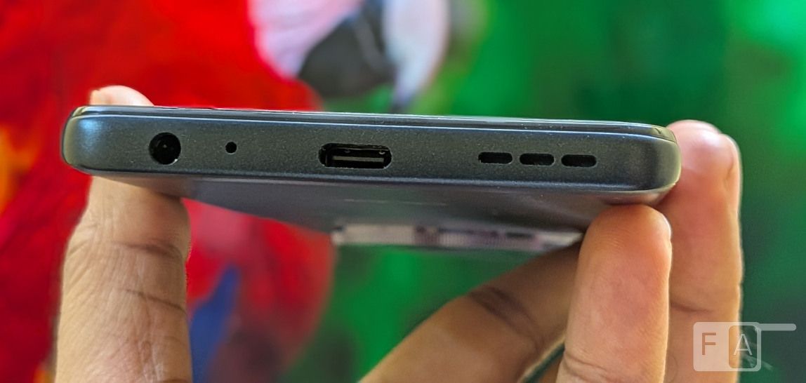 The 3.5mm audio jack is present on the bottom, along with the primary microphone, USB Type-C port and the loudspeaker grill. The secondary microphone, and the speaker vent are present on the top.