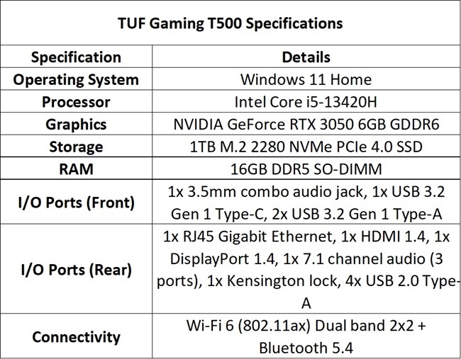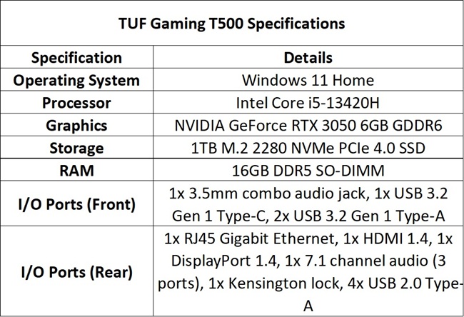 The TUF Gaming T500 is equipped with an Intel Core i5-13420H processor and an NVIDIA GeForce RTX 3050 GPU, along with 16GB of RAM and a 1TB PCIe 4.0 SSD.