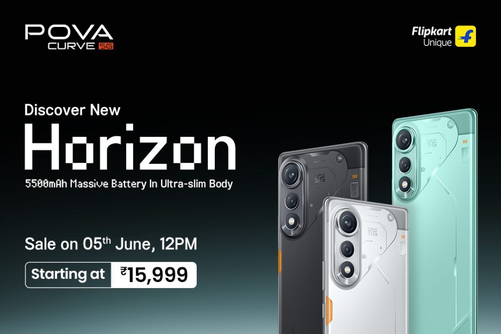 The TECNO POVA Curve 5G comes in Magic Silver, Neon Cyan, and Geek Black colours and is priced at Rs. 15,999 for the 6GB + 128GB model and 8GB+128GB version costs Rs. 16,999. The phone will be available from Flipkart starting from June 5th, and the 8GB model will be available from offline stores.