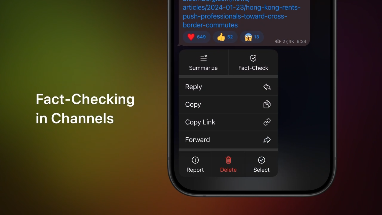 - Fact Check in Telegram channels should help users fact-check a message before taking any action.