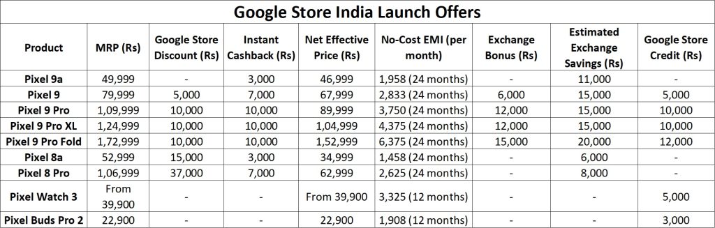 - No-Cost EMI Plans: Eligible buyers can choose no-cost EMI plans lasting up to 24 months for Pixel phones, and up to 12 months for the Pixel Buds Pro 2 and Pixel Watch 3.
