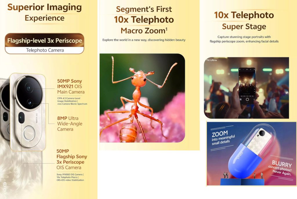 vivo has confirmed that the T4 Ultra will pack a 50MP main camera with Sony IMX921 sensor with OIS, CIPA 4.5 camera-level image stabilization, vivo camera bionic spectrum, 8MP ultra-wide camera, and a 50MP 3x periscope telephoto camera with OIS + EIS, Sony IMX882 sensor, and segment’s first 10x telephoto macro option. It will also come with up to 100x zoom.