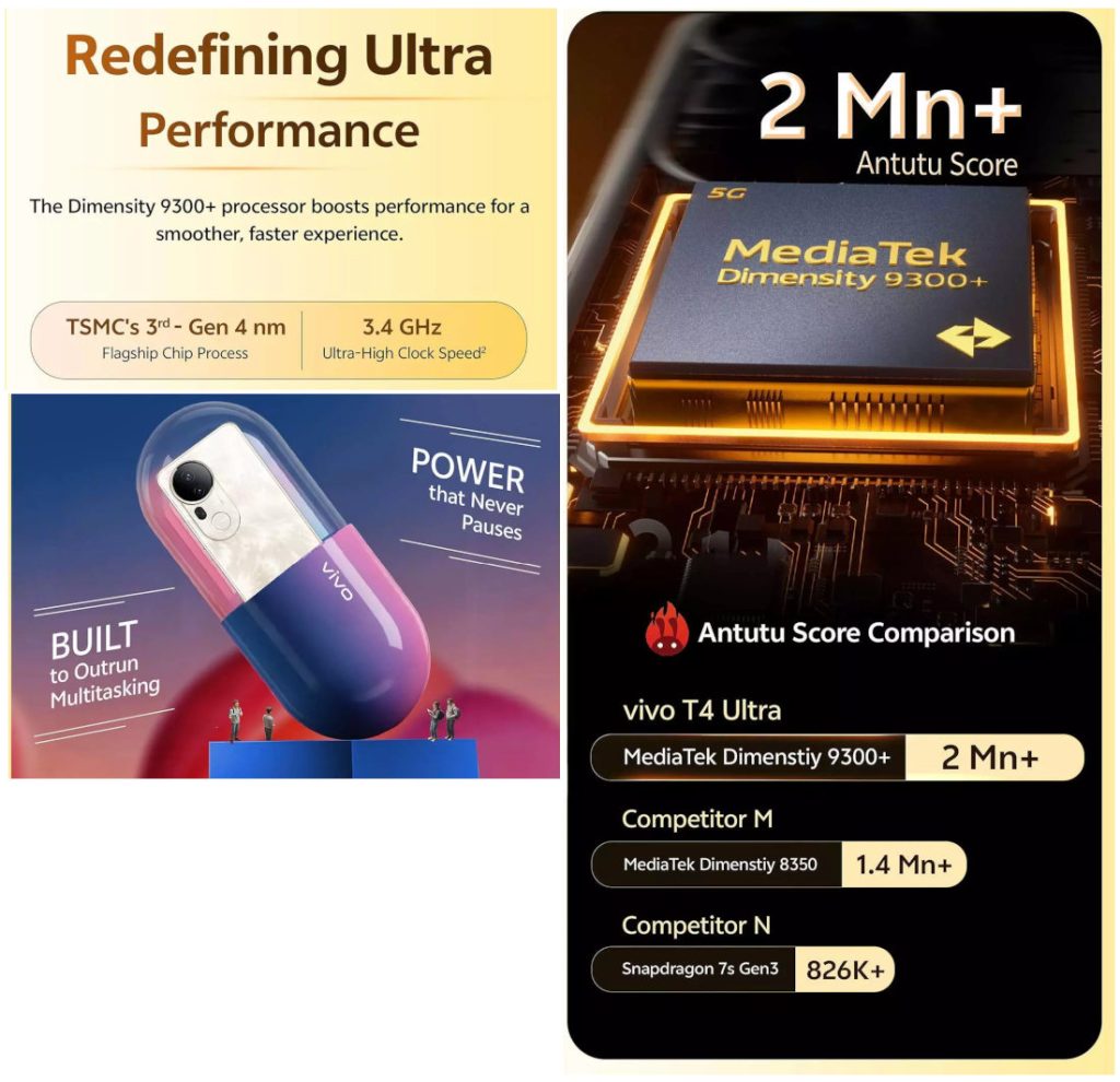 vivo has also confirmed that the phone will be powered by MediaTek Dimensity 9300+ SoC, an upgrade compared to 9200+ in the T3 Ultra. It claims over 2 million points on AnTuTu. The company has also confirmed 1.5K quad-curved display for the phone.