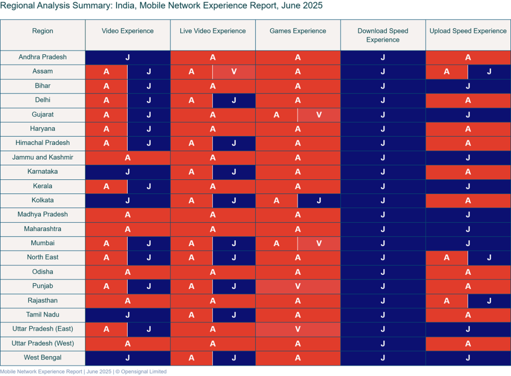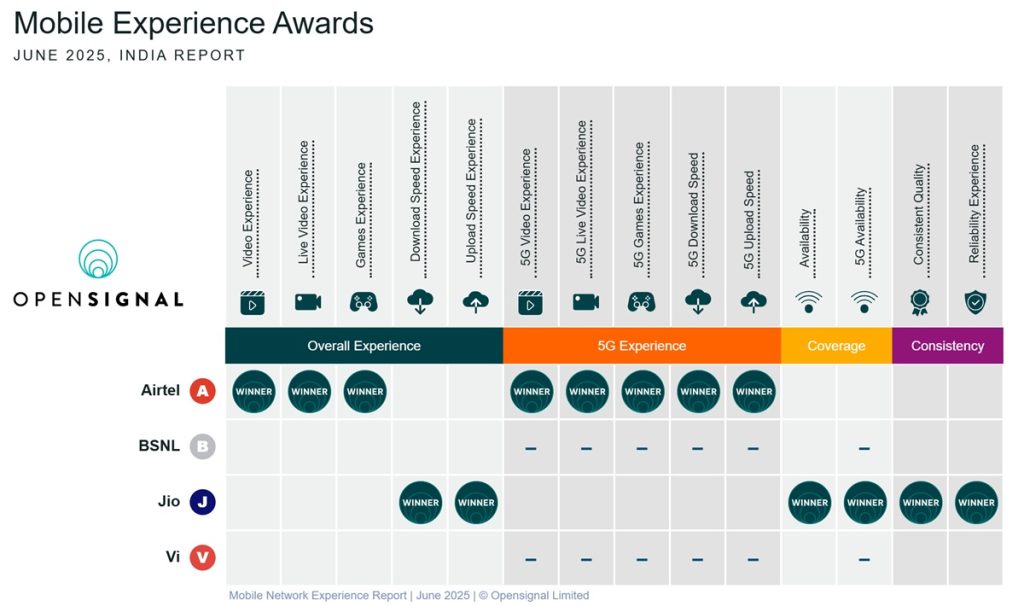 Opensignal published its June 2025 Mobile Network Experience report, based on data collected from February 1 to May 1, 2025. The report reviews the performance of India’s main mobile operators across various metrics during this period.
