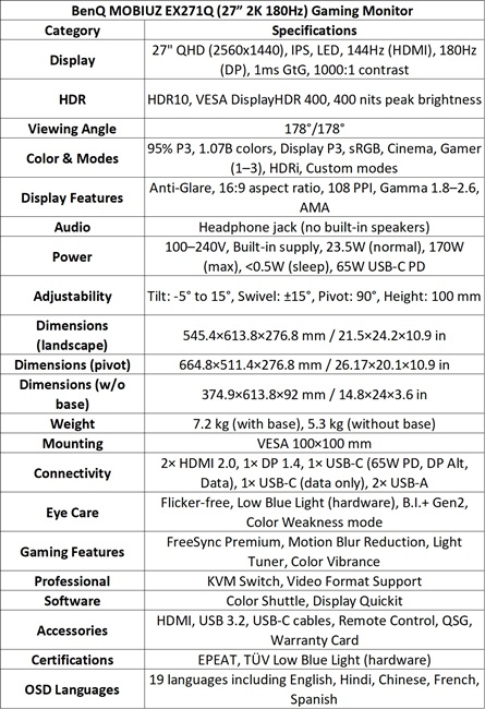 The EX271Q includes a 27-inch QHD display, 180Hz refresh rate, 1ms GtG, AMD FreeSync, DisplayHDR 400 support, and USB-C connectivity. It’s suited for gamers seeking higher clarity and smooth visuals.