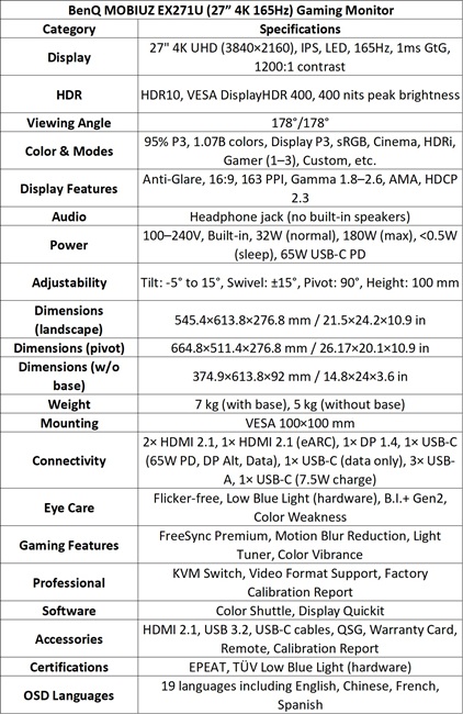 The EX271U, the top-tier model, has a 27-inch 4K UHD display, 165Hz refresh rate, HDMI 2.1, eARC for 7.1-channel audio, and DisplayHDR 400 certification. It targets high-end PC and console gamers who prioritize visual and sound quality.