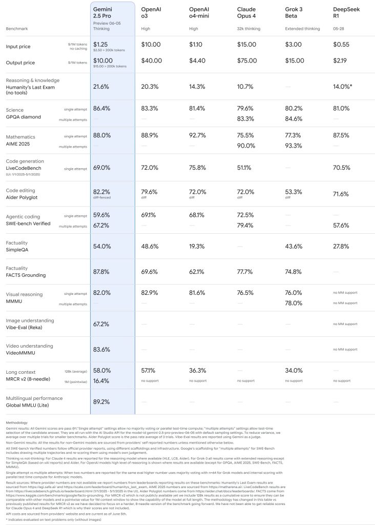 Gemini 2.5 Pro ranks high across major AI benchmarks, outperforming OpenAI’s o3 and o4-mini, Claude Opus 4, Grok 3 Beta, and DeepSeek R1. Key scores include: