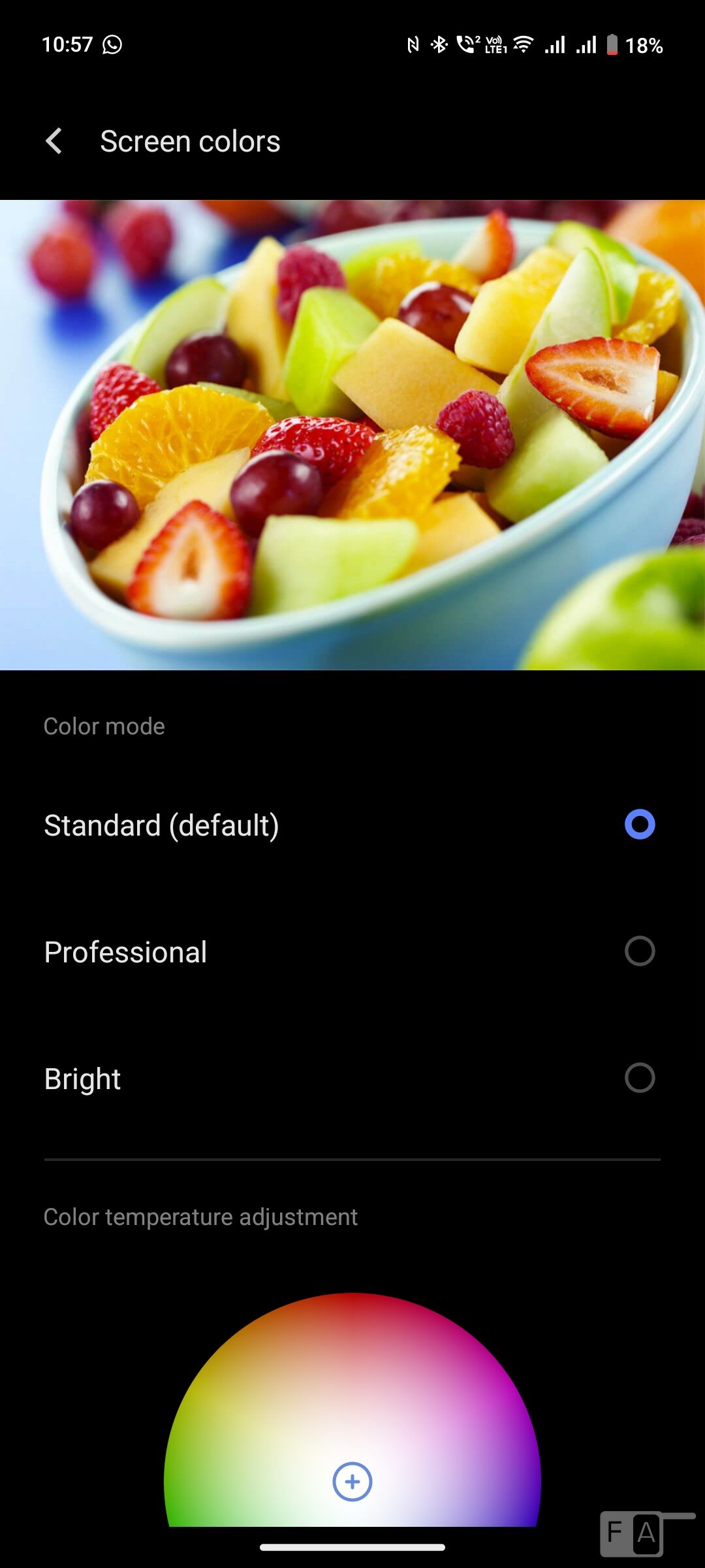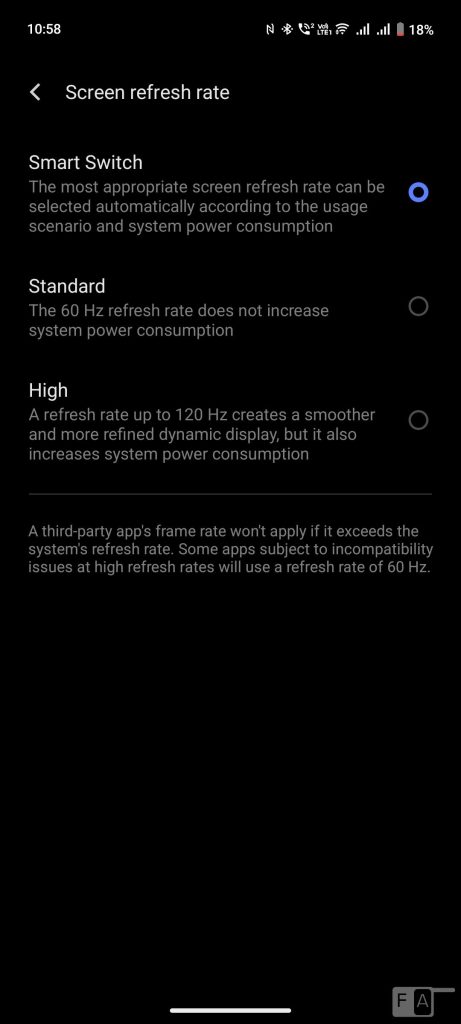 You can select from standard (default), professional and bright screen colour modes. You can select smart switch that can switch or force it to 60Hz or 120Hz. It has 300Hz touch sampling rate and up to 2160Hz High-frequency PWM dimming.