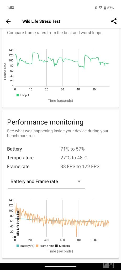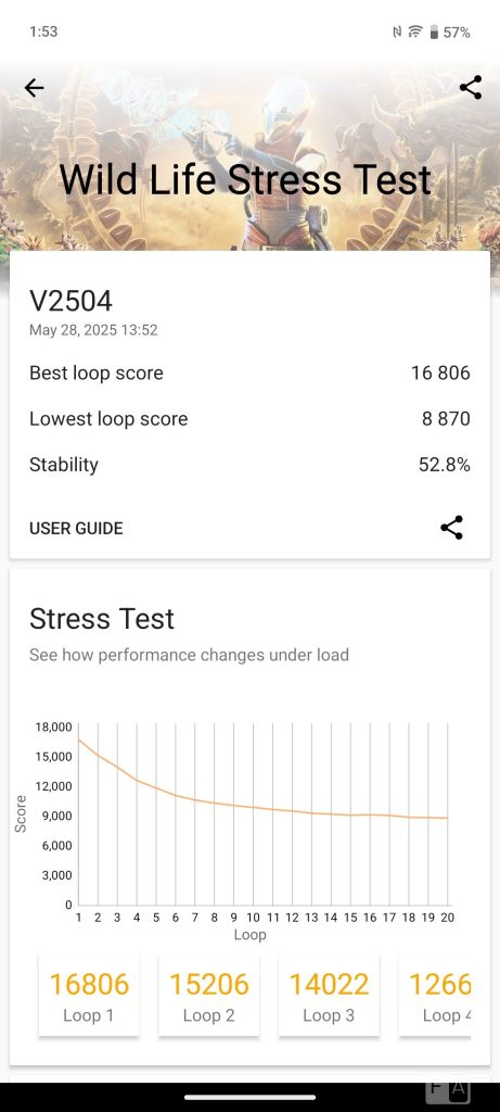 We did not face any issues or frame drops in the graphic-intensive games like COD, BGMI and Genshin Impact. There is also 120fps gaming in games like BGMI. Thermal throttling was there. In 3D Mark wild life stress test, it scored 52.8%, and the temperature shot up from 27 to 48 degrees. The score is decent, but it heats up more on intensive usage, such as gaming. That said, check out some synthetic benchmark scores below.