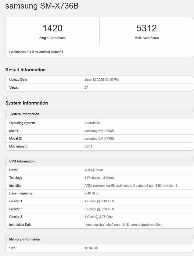 The Samsung Galaxy Tab S11 Ultra, bearing model SM-X736B, will feature MediaTek’s current flagship 3nm octa-core 5G SoC, the Dimensity 9400+. This processor is the successor to the Dimensity 9300+, used on the Galaxy Tab S10 Ultra.