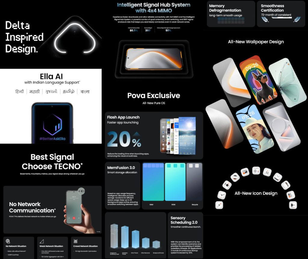 Teasers for the POVA 7 Series highlight an all-new multi-functional Delta light interface. This dynamic visual element is inspired by the delta symbol (Δ), intended to signify change and progress. The interface is designed to respond to various everyday actions, including music playback, volume control, and notifications, adding an interactive dimension to the user experience.