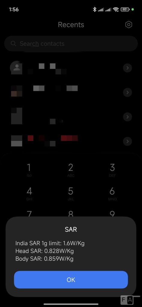 The POCO F7 Pro’s body SAR is 0.859W/Kg and head SAR is at 0.828/Kg, that is well under the limit of 1.6 W/kg (over 1 g) in India.
