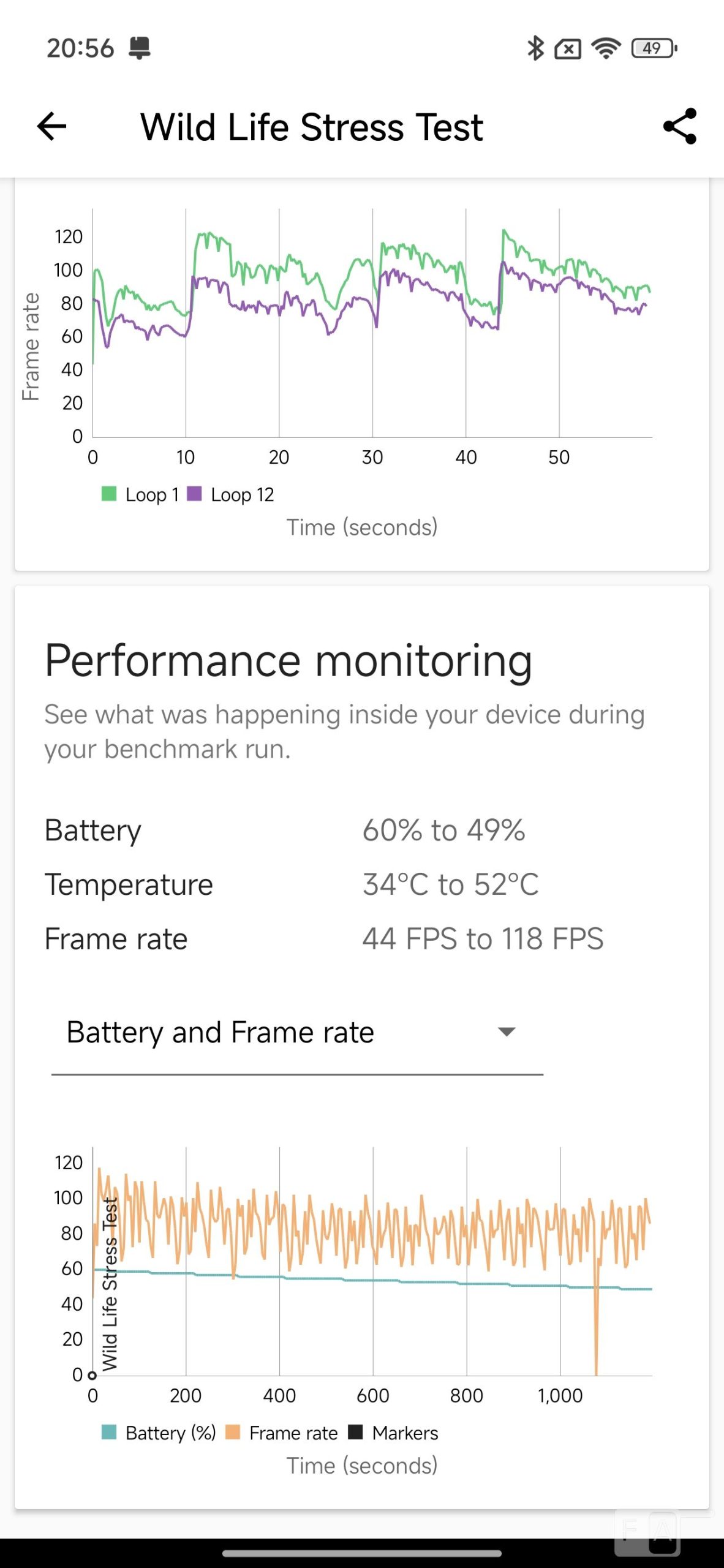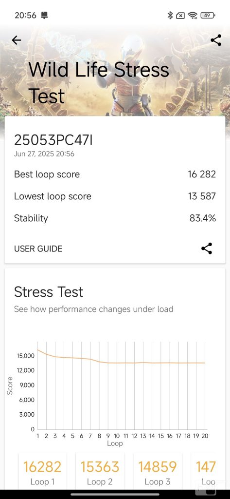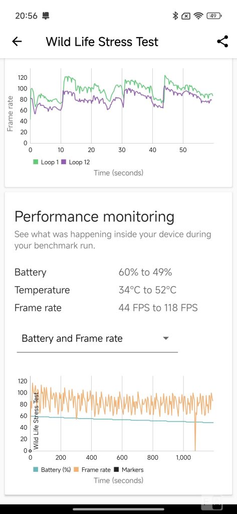 In 3D Mark wild life stress test, it scored 83.4%, which is slightly better than the POCO F6. The temperature shot up from 34 to 52 degrees, almost similar to the POCO F6. That said, check out some synthetic benchmark scores below.