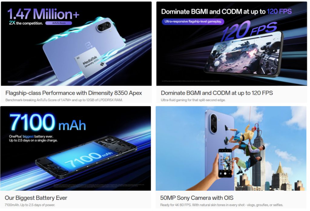 The OnePlus Nord CE5 will be powered by the MediaTek Dimensity 8350 Apex chipset, and the company claims AnTuTu score of over 1.47 million, which it says is the highest in its class. It will feature LPDDR5X RAM. It will offer 120fps gaming experience in BGMI and COD Mobile.