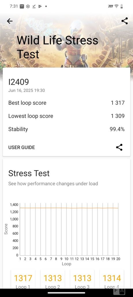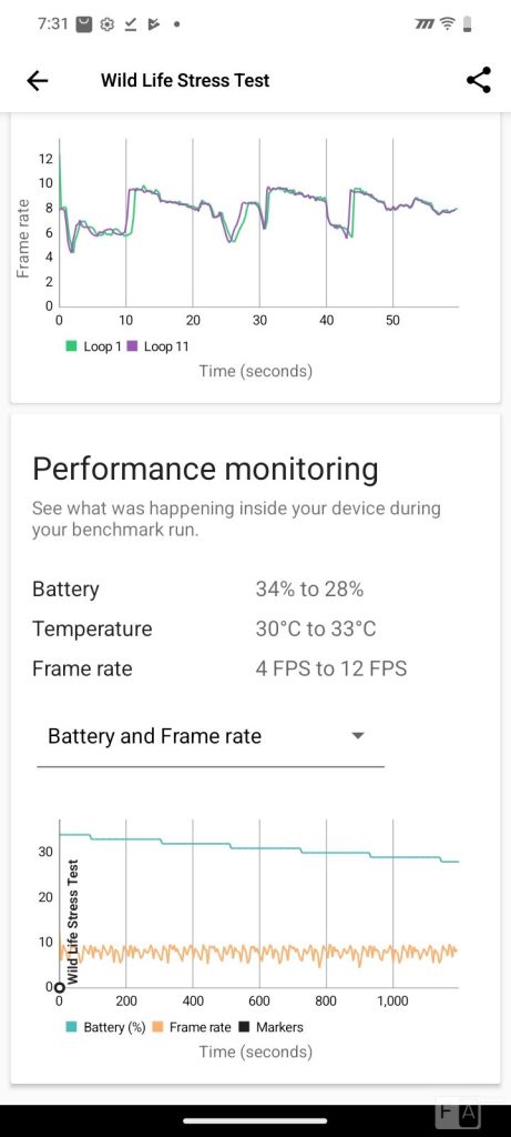 In 3D Mark wild life stress test, it scored 99.4% which is just good. The temperature shot up from 30 to 33 degrees, which is not much. That said, check out some synthetic benchmark scores below.
