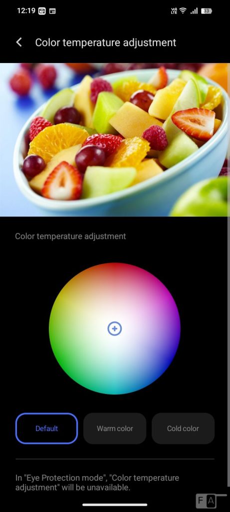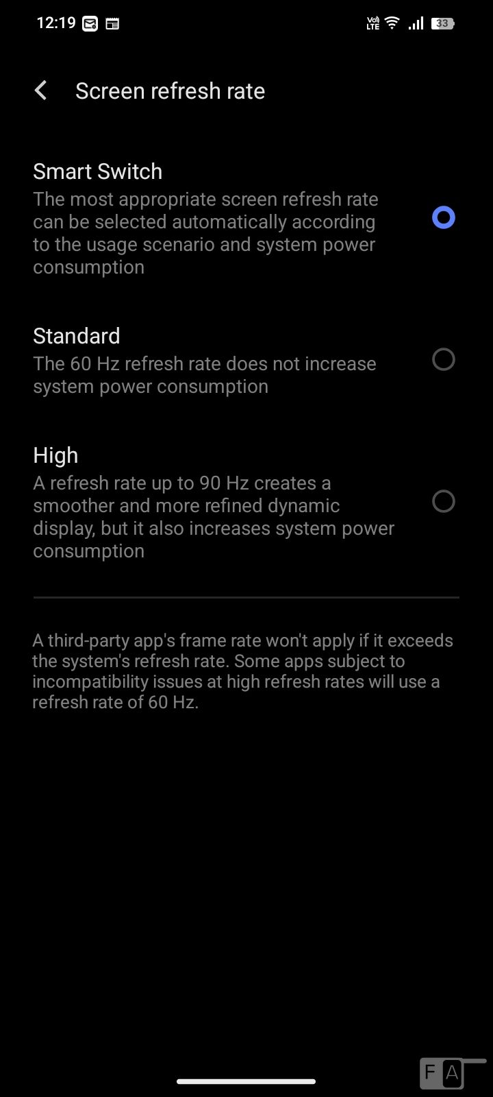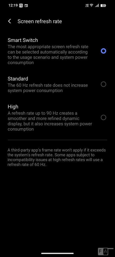 The 90Hz refresh rate offers a smooth user experience, especially when you are scrolling through the UI and when gaming. You can select from standard (default), professional and bright screen colour modes. You can select smart switch or force it to 60Hz or 90Hz.