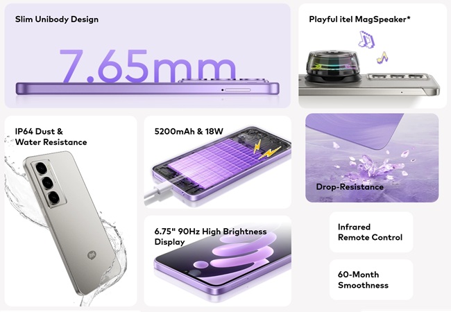 Available for Rs. 7,599, the itel City 100 comes in three colors: Fairy Purple, Navy Blue, and Pure Titanium. It is available for purchase at retail locations nationwide. The brand offers a free screen replacement within the first 100 days, along with a limited-time magnetic speaker valued at Rs. 2,999.