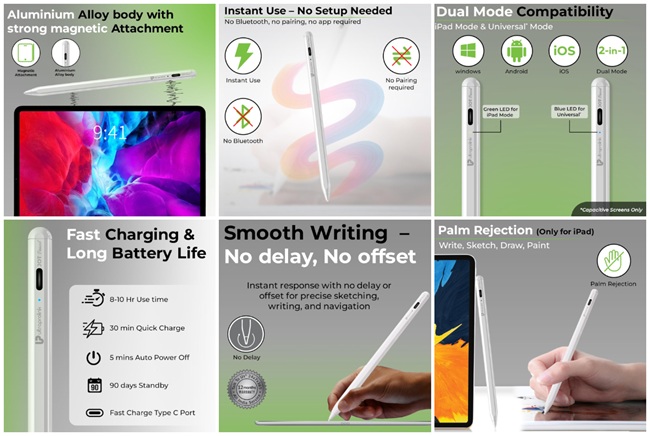 The stylus body is made from aluminum alloy and supports magnetic attachment to compatible iPads. The stylus supports two operating modes: iPad Mode with palm rejection and Universal Mode for all other capacitive touchscreen devices.