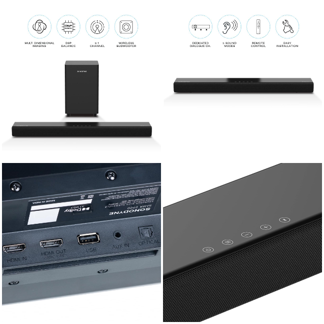 Setup is simple using the included HDMI cable, and it can be placed on a table or wall-mounted. An IR remote is included for control. The SAMĀ 5000 supports Dolby Atmos to create a wide soundstage suited for movies and music. A dedicated center channel ensures clear dialogue, while height effects make voices seem aligned with the screen.