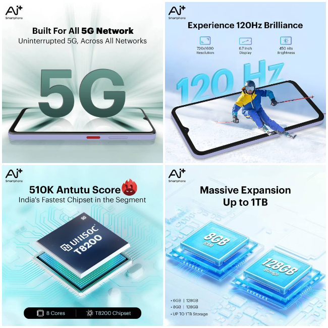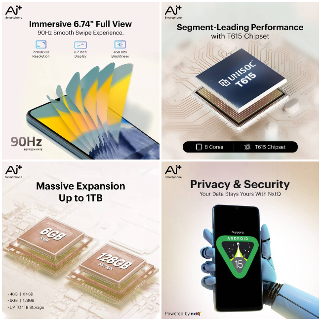The Ai+ Pulse features a 6.7-inch HD+ display with a 90Hz refresh rate and 450 nits brightness. It measures 8.5mm in thickness and weighs around 193g. Powered by the Unisoc T615 octa-core processor, it comes with 4GB or 6GB RAM and 64GB or 128GB internal storage, expandable up to 1TB via microSD.