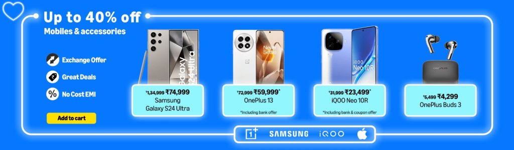 - iQOO Neo 10R 5G: Rs. 23,499 including Rs. 2,000 Instant Bank Discount, Rs. 500 Coupon, and up to 6 months No Cost EMI