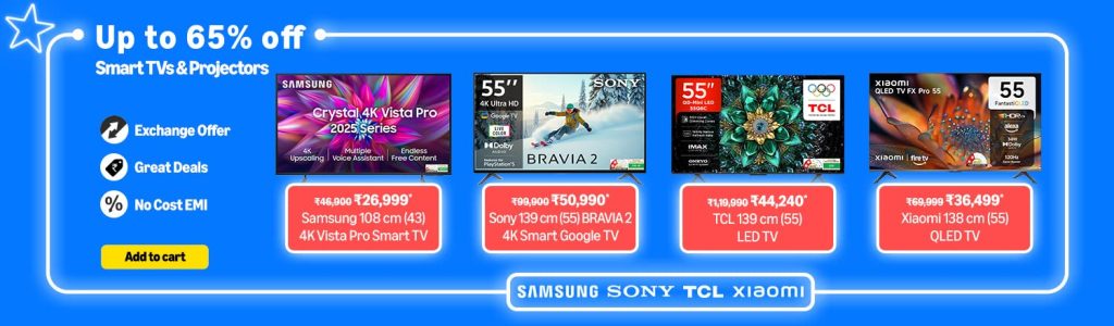 - Sony 55″ BRAVIA 2 4K Ultra HD Smart LED TV: Rs. 49,999, includes Rs. 5,000 SBI discount and up to 9 months No Cost EMI