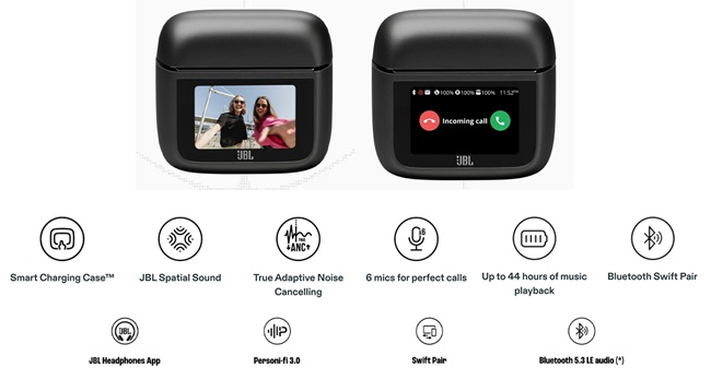 Bluetooth 5.3 powers the earbuds, with LE Audio arriving via OTA update. The earbuds offer 360 Spatial Sound with Head Tracking and personalized modes for entertainment. Each earbud features JBL’s Adaptive Noise Cancelling 2.0 and noise-blocking foam tips. Three microphones per bud—two beamforming, one internal—work with Crystal AI for call optimization.