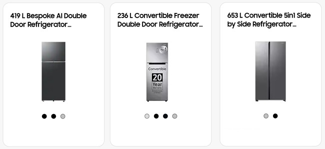 Up to 49% off, instant cart discount up to Rs. 5,000, Samsung Care+ offer with 1-year extended warranty worth Rs. 4,490 at Rs. 449 (on Side by Side & French Door models), 20 years warranty on Digital Inverter Compressor, and EMI starting at Rs. 1,290.