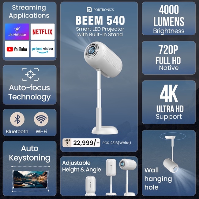 Portronics has launched the Beem 540 Smart LED projector in India, expanding its compact projector lineup. The device includes a telescopic stand for easy height and tilt adjustments. It can be placed on tables or mounted on walls or ceilings using an integrated mounting slot, suitable for various room sizes.