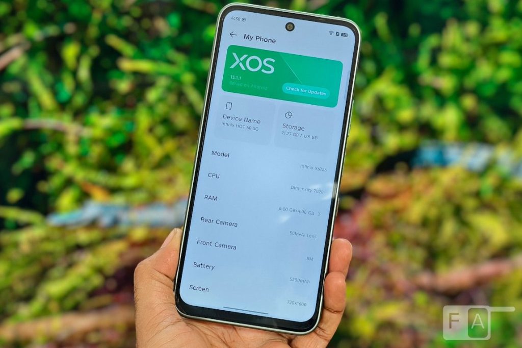 Under the hood, the Hot 60 5G+ is powered by the MediaTek Dimensity 7020 processor. It has support for 10 5G bands, has 6GB of LPDDR4X RAM and 128GB UFS 2.2 storage.